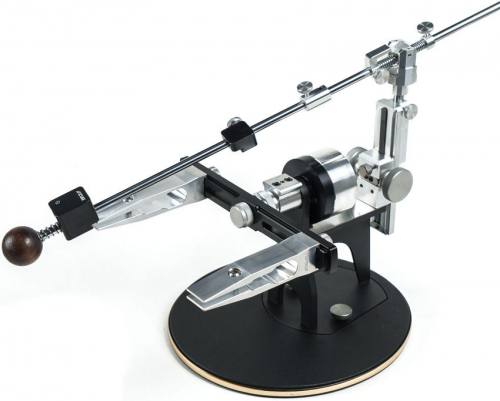 Full-size professional sharpening system. Axicube-I angle finder. 7075T6 aircraft aluminum construction. Semi-automatic turning mechanism. One-hand angle adjustment. Sharpening angle: from 10 degrees to 39 degrees (from 8.5 with fillet clamps) per side, maximum total angle up to 78 degrees. Blade thickness: up to 7mm/0.275". Blade length: from 2.4" - 17.7". Universal holder: use any flat-end or Edge Pro stones up to 210 mm long. Includes set of five diamond plates (150-1000 grit). Boxed.