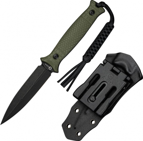 9.25" (23.5cm) overall. 4.5" (11.43cm) black stonewash finish double edge 14C28N Sandvik stainless dagger blade. OD green G10 handle. Full tang. Lanyard hole. Braided cord lanyard. Black Kydex belt sheath. Boxed.