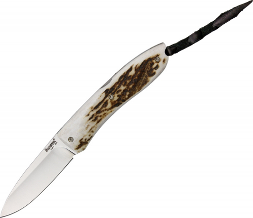 4" (10.16cm) closed. 3" (7.62cm) satin finish D2 tool steel drop point blade. Stag handle. Lanyard hole. Black leather sleeve. Boxed.
