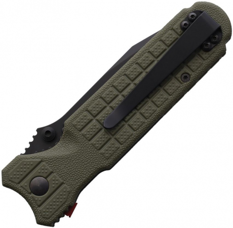 4.5" (11.43cm) closed. 3.75" (9.53cm) black coated Niolox tool steel tanto blade. OD green textured FRN handle. Thumb stud. Pocket clip.