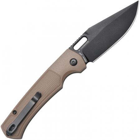 4.5" (11.43cm) closed. 3.5" (8.89cm) black PVD coated AR-RPM9 stainless clip point blade. Brown FRN handle. Thumb pull. Pocket clip. Black nylon zippered storage case. Boxed.
