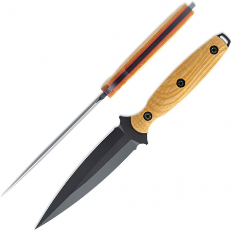 9.63" (24.46cm) overall. 4.75" (12.07cm) black Gun-Kote finish double edge CPM-M4 stainless dagger blade. Natural sculpted micarta handle. Full, extended tang. Lanyard hole. Red G10 liners. DuoTone Kydex belt sheath. Boxed.