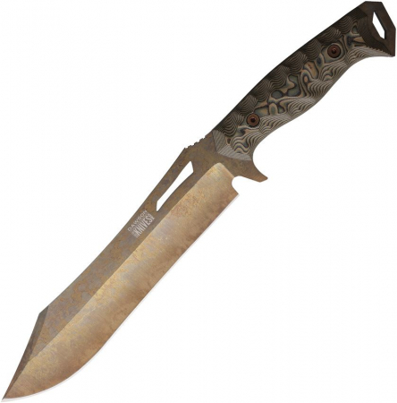 14" (35.56cm) overall. 8.5" (21.59cm) Arizona copper finish CPM MagnaCut stainless blade. Ultrex camo sculpted G10 handle. Full, extended tang. Lanyard hole. Black Kydex belt sheath. Bulk packed.