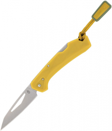 2.75" (6.99cm) closed. 1.75" (4.45cm) stonewash finish 440A stainless Wharncliffe blade. Yellow GFN handle. Lanyard hole. Thumb pull.