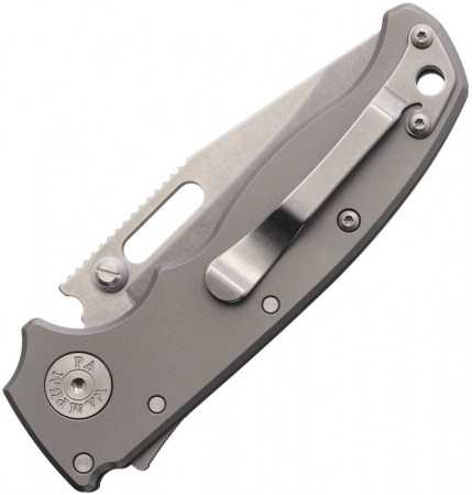 4.75" (12.07cm) closed. 2.88" (7.32cm) stonewash finish CPM-20CV stainless clip point blade. Gray smooth titanium handle. Thumb pull. Extended tang. Pocket clip. Comes in plastic case.