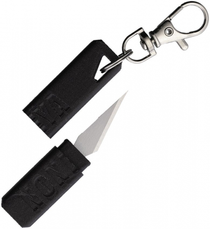 2.5" (6.35cm) overall. 1.13" (2.87cm) stainless blade. Keyring. Black 3D printed handle and blade cover. Bagged.
