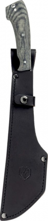17.13" (43.51cm) overall. 11.13" (28.27cm) blasted satin finish convex edge 1075HC steel blade. Black canvas micarta handle. Full tang. Lanyard hole. Brown leather belt sheath. Boxed.