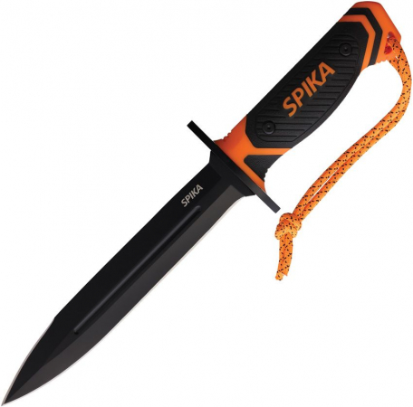 14" (35.56cm) overall. 8" (20.32cm) black oxide coated 440 stainless blade. Orange and black rubberized synthetic handle. Full tang. Cord lanyard. Black nylon belt sheath.