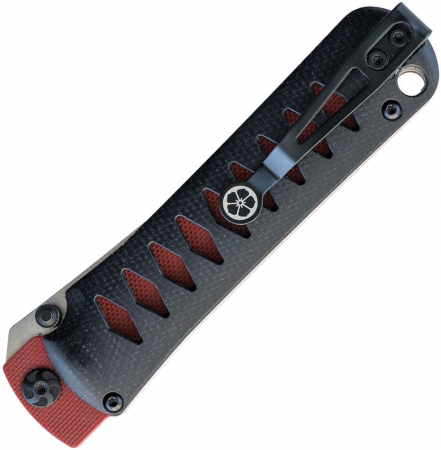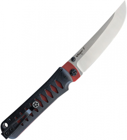 4" (10.16cm) closed. 3.75" (9.53cm) stonewash and satin finish D2 tool steel blade. Black canvas micarta handle. Thumb stud. Lanyard hole. Pocket clip. Red G10 liners. Boxed.