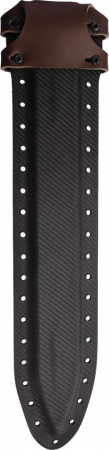 22.5" (57.15cm) overall. 16" (40.64cm) Arizona copper finish CPM MagnaCut stainless blade. Black and gray G10 handle. Full tang. Carbon fiber and brown leather belt sheath.