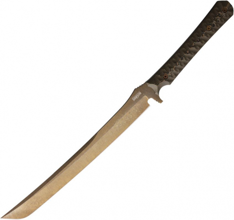20.38" (51.77cm) overall. 13" (33.02cm) Arizona copper finish CPM MagnaCut stainless tanto blade. Black and tan sculpted G10 handle. Full tang. Black Kydex belt sheath.