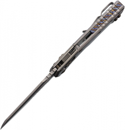 5" (12.7cm) closed. 3.75" (9.53cm) stonewash finish partially serrated sheepsfoot blade. Stonewash titanium handle. Thumb pull. Lanyard hole. Pocket clip. Marfione Select edition. Flame titanium accents. Bronzed double vapor blast stainless blade. Boxed.