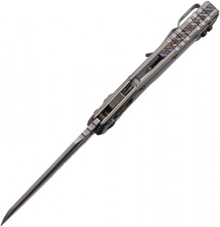 5" (12.7cm) closed. 3.75" (9.53cm) stonewash finish serrated sheepsfoot blade. Stonewash titanium handle. Thumb pull. Lanyard hole. Pocket clip. Marfione Select edition. Flame titanium accents. Bronzed double vapor blast stainless blade. Boxed.