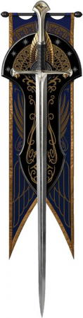 52.78" (134.06cm) overall. 40.63" (103.2cm) 1060HC steel blade. Brown leather wrapped handle. Museum Collection. Antique finish metal crossguard and pommel and 24K gold plated fittings. Serialized. Certificate of Authenticity. Includes 14.13" wooden wall display with detailed gold-plated metal crest and sword mounting arms. Also includes Gondorian themed blue cloth banner that can be hung behind display. Boxed.
