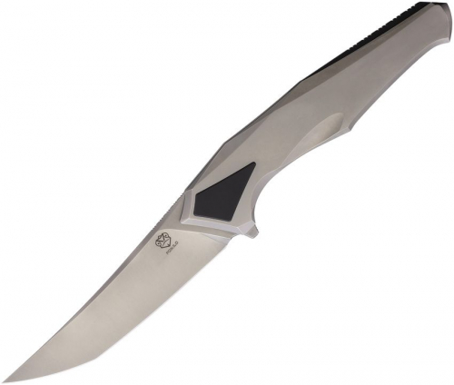 5" (12.7cm) closed. 3.5" (8.89cm) Bohler M398 stainless tanto blade. Gray titanium handle. Extended tang. Pocket clip. Pearlescent stonewash finish blade. Black synthetic pouch. Bagged.