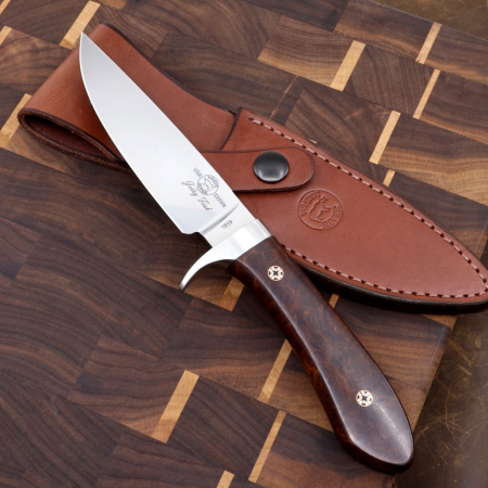The White River Sendero Classic with a Desert Ironwood Burl Handle and Mosaic Pins. Includes a beautiful hand made custom leather sheath. A true one-of-a-kind.