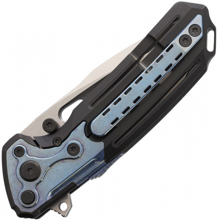 5.25" (13.34cm) closed. 4" (10.16cm) stonewash and satin finish MagnaCut steel blade. Black DLC coated titanium handle with Crystallized blue titanium onlay. Extended tang. Pocket clip. Thumb stud. Serialized. Boxed.