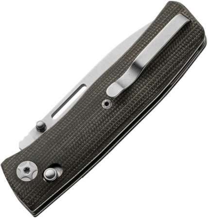3.75" (9.53cm) closed. 2.63" (6.68cm) satin finish Bohler M390 stainless drop point blade. Green canvas micarta handle. Thumb stud. Pocket clip. Boxed.