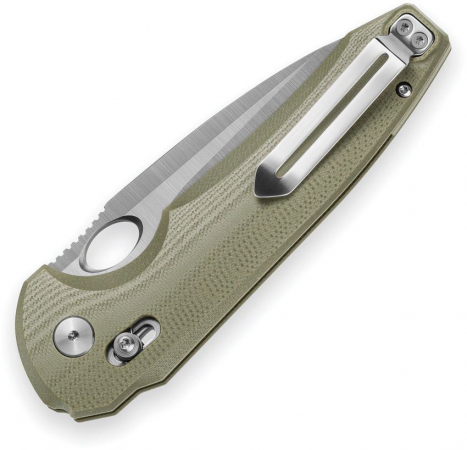 5.13" (13.03cm) closed. 3.75" (9.53cm) satin finish 14C28N Sandvik stainless drop point blade. OD green G10 handle. Thumb pull. Pocket clip