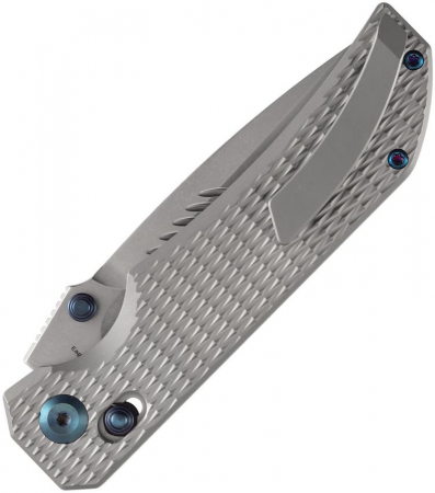 4.63" (11.76cm) closed. 3.75" (9.53cm) stonewash finish CPM S30V stainless spear point blade. Bead blast finish titanium handle. Thumb stud. Pocket clip. Diamond pattern handle. Blue accents. Boxed.
