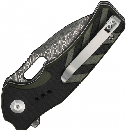 4.25" (10.8cm) closed. 3" (7.62cm) Damascus steel drop point blade. Black and green G10 handle. Extended tang. Thumb pull. Pocket clip. Black nylon zippered storage case. Boxed.