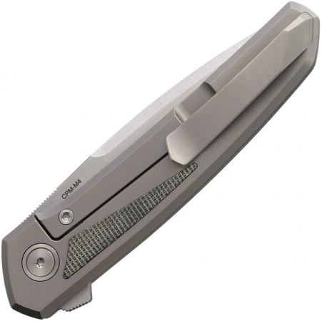 4.38" (11.13cm) closed. 3.38" (8.59cm) satin finish flat ground CPM-M4 stainless drop point blade. Gray titanium handle with black and brown micarta inlay. Pocket clip. Extended tang. Boxed.