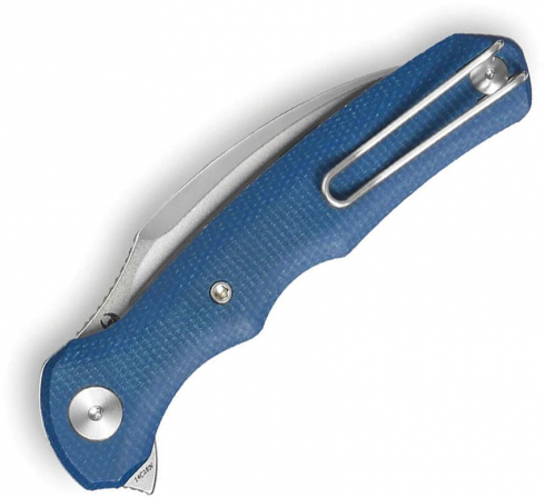 4.38" (11.13cm) closed. 3.38" (8.59cm) stonewash finish 14C28N Sandvik stainless curved blade. Blue canvas micarta handle. Extended tang. Pocket clip. Tiguass design. Boxed.