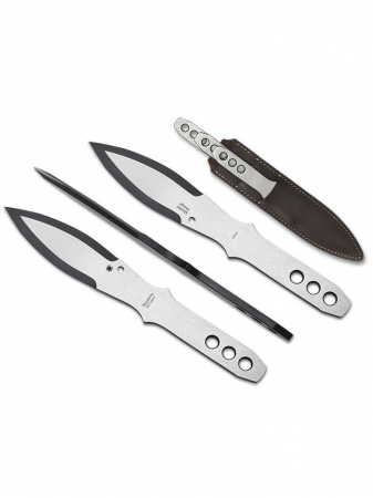 For decades, Canadian custom knifemaker Harald Moeller’s throwing knives have been regarded as some of the finest in the world. The product of Moeller’s uncompromising quest to develop the perfect throwing knife, these highly refined designs are much easier to throw and stick consistently than their competition. Through an exclusive arrangement with Moeller, Spyderco is now proud to manufacture his world-class throwing knife designs and make them available under the Spyderco brand. Painstakingly machined from thick 5.5mm (.216-inch) 8Cr13MoV stainless steel and tempered to a tough spring hardness, SpyderThrowers sport a contrasting two-toned black oxide and satin finish. Their substantial heft and precise center balance allow them to be thrown equally well by the blade or the handle for half or full-spin throws. SpyderThrowers are available in three different sizes, but remarkably all share the same common throwing characteristics and throwing distances. They are sold in sets of three knives of the same size and every set comes complete with a high-quality tiered leather sheath.