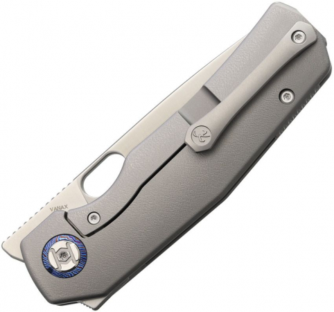 4.75" (12.07cm) closed. 3.5" (8.89cm) satin finish Vanax steel drop point blade. Orange peel titanium handle. Extended tang. Thumb pull. Pocket clip. Boxed.