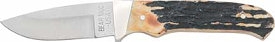 7" overall. 2 7/8" high carbon 440 stainless drop point blade. Full tang. India stag bone handles with nickel silver finger guard. Brown leather belt sheath.