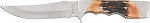 9 3/8" overall. 5" stainless upswept skinning blades. Full tang. India stag bone handles with nickel silver finger guard and pommel. Genuine leather belt sheath.
