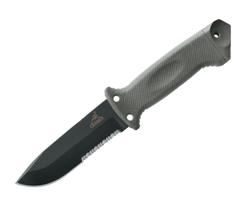 Back by popular demand and successor to the LMF, the Gerber LMF II has features worth noting. The 4.84" stainless steel blade is partially serrated and easily cuts through straps and belts. On the end of the knife is a flat spot strong enough to drive a nail and a point rigid enough to shatter plexiglass. The shape of the handle allows the knife to tie onto the end of a shaft thus converting it to a spear. Inside the hard plastic sheath is an integrated sharpener. The sheath can be easily adapted to mount the knife on your belt, arm, leg, or jacket.