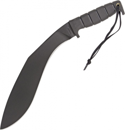 16 3/4" overall. 11 3/4" 1095 carbon steel kukri style blade. Black grooved Kraton handle. Lanyard hole. Black cordura belt sheath with leg ties. Bulk packed.