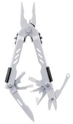 Components: Needlenose pliers, wire cutter, wire crimper, serrated knife blade, Fiskars® scissors, cross point screwdriver, small, medium and large flat blade screwdrivers, can opener, bottle opener.