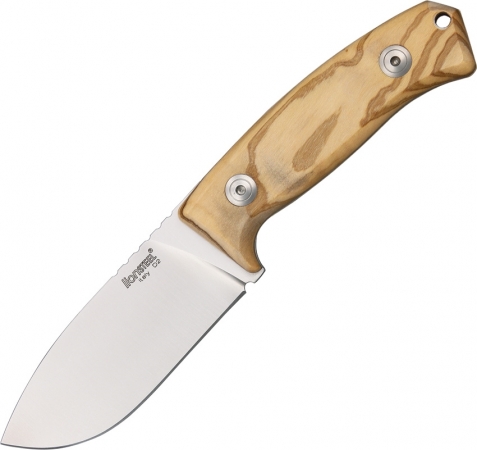 7 3/4" overall. 3 1/2" D2 tool steel blade. Full tang. Textured olive wood handles. Lanyard hole. Brown leather belt sheath.